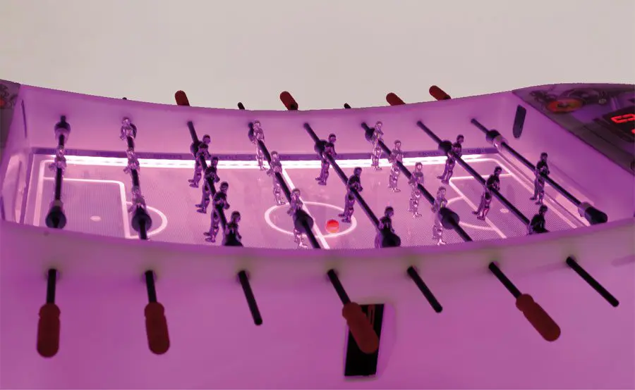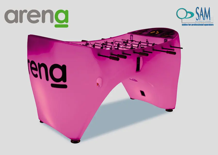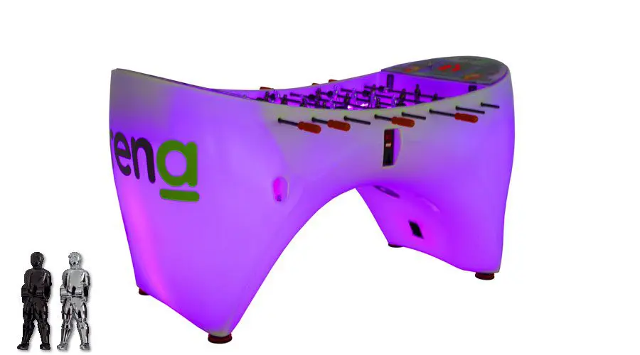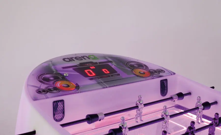De elektronische voetbaltafel ARENA is gebouwd in een kunststof kast uit één stuk met vier levellers voor de beste installatie. De kast kan van binnenuit verlicht worden met intelligente RGB LEDS RGB. Aan beide kanten van het speelveld is de score in LED weergegeven.