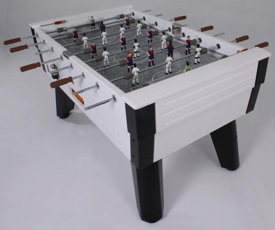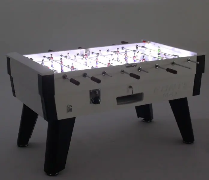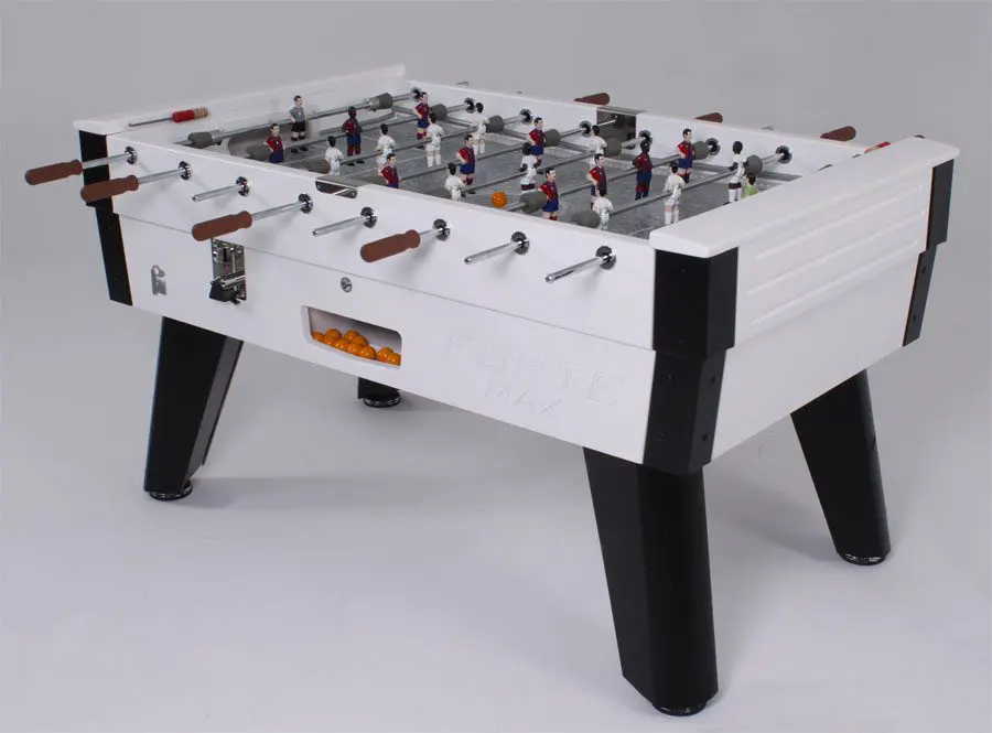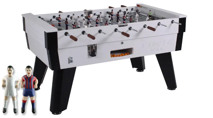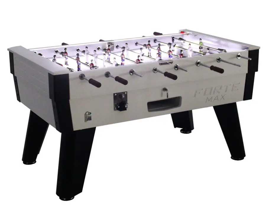 Een zorgvuldige fabricage in massief hout met metalen poten en levellers, met een gebogen speeloppervlak om te voorkomen dat de bal stopt, dragen ertoe bij dat de FORTE MAX een sterke en aantrekkelijke voetbaltafel is. Operators kunnen kiezen voor de mechanische of elektronische munintworp.